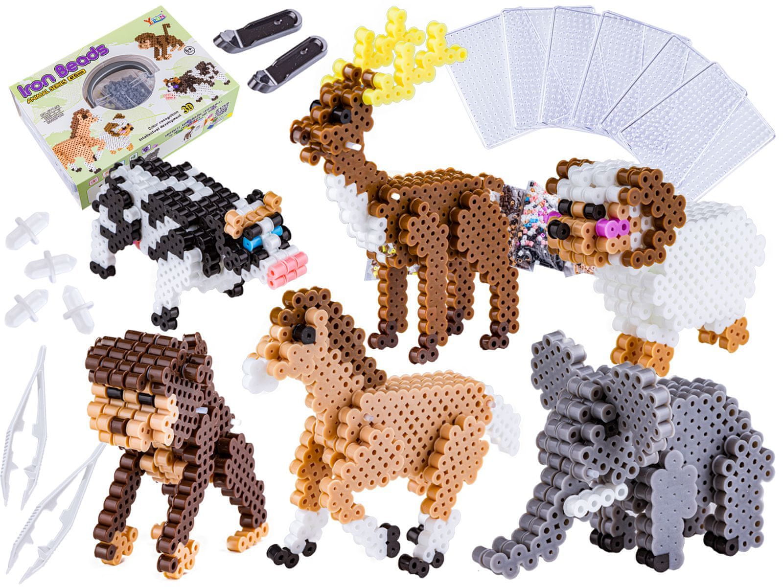 3D likalna deska, likalne perle – živali Barvite likalne perle so odlična ideja za ustvarjalno igro – učinkovito vas zaposlijo za dolge ure in sprožijo popoln vulkan kreativnih idej! slon, krava, opica, jelen in jagnje. Iznajdljiv otrok – ponosen starš. Set je sestavljen iz številnih pisanih plastičnih kroglic in omogoča sestavljanje 3D figur živali. Ta igrača bo zagotovo spodbudila domišljijo in pripomogla k razvoju ročnih spretnosti. Odličen komplet bo vsakemu otroku prinesel veliko zabave. Ta komplet razvija: Motorične sposobnosti – ko otroci zgrabijo perlo s prsti ali pinceto in jo položijo na blazinico, izboljšajo svojo spretnost rok in poleg tega ponavljajo to dejanje. velikokrat, Zbranost – proces ustvarjanja zahteva osredotočeno pozornost, Zaznavanje – otroci iščejo ustrezne barve, potrebne za določen aranžma, Vztrajnost in potrpežljivost – za učinek se je treba potruditi, včasih ti perlica uide izpod prsta, včasih prevrne se ipd. Izvirne umetnine S stisnjenimi perlicami lahko okrasite prostor ali pa iz njih naredite obesek za ključe ali obesek. Navodilo: Desko za razporejanje perlic položite na navodila, Perlice razporedite po vzorcu iz šablone, Položite peki papir in zlikajte, Pri likanju pazite, da se perlice ne stopijo popolnoma – pomembno je, da se povežejo, ampak da je luknje, ki ostanejo za namestitev konektorjev, Nadaljujte, dokler ne dobite vseh delnih elementov. S posebnim prijemalom za bele konektorje namestite konektorje na ustrezna mesta (to je navedeno v podrobnih navodilih sestavljanje) Vse elemente povežite s konektorji in stisnite, uživajte v sestavljeni igrači :) Opomba: pri stiskanju perlic je potrebna pomoč odrasle osebe. Komplet vsebuje: škatlo s pokrovom, perle v različnih barvah – 6 vrečk -. ena vrečka je namenjena za aranžiranje enega aranžmaja, Bloki za aranžiranje: 6 pravokotnih blokov dimenzij 10 × 7,5 cm, Natančna navodila za aranžiranje vsakega od 6 krojev, Papir za likalnik, 2 črna ročaja za nameščanje konektorjev, torbica z belimi konektorji Specifikacija: Izdelek je primeren za: otroke nad 6 let Premer perle: 5 mm Mere pakiranja: pribl. 3000