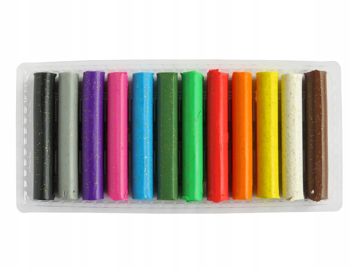 Paket vsebuje 12 koščkov bleščeče modelirne gline, vsak v drugi barvi.