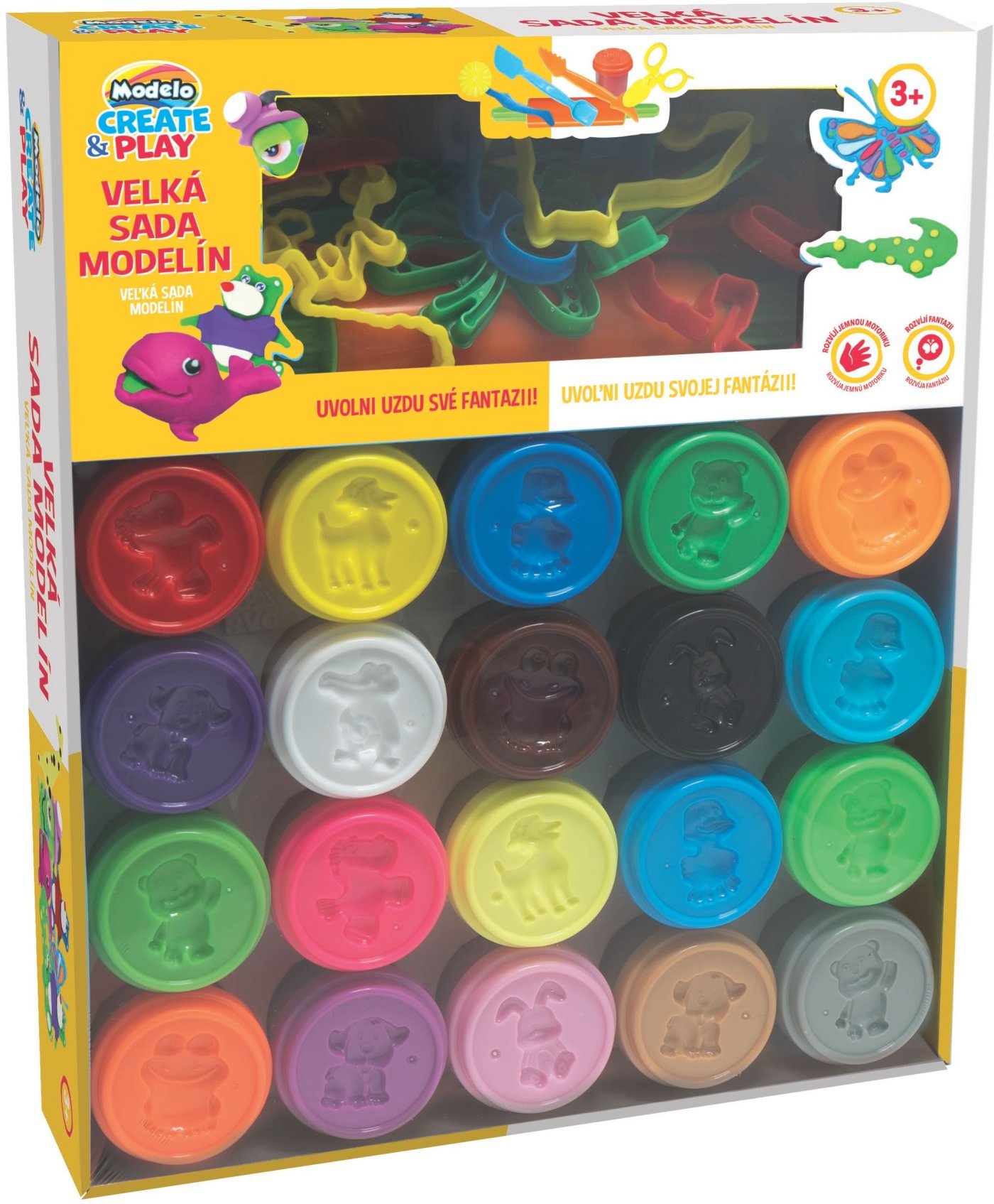 Velik komplet gline za modeliranje, ki vključuje 20 skodelic ter veliko oblikovalnikov in izrezov za vaše stvaritve. Pokrovčke vseh skodelic lahko uporabite kot iztiskalnike.