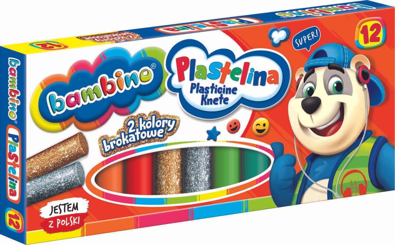 BAMBINO plastelin, 12 barv Lastnosti izdelka: prožen, enostaven za modeliranje intenzivne, žive barve se ne primejo na površino ne umažejo rok omogoča ustvarjanje del z millefiori varen za otroke izpolnjuje bistvene zahteve Direktive 2009/48/ES Evropskega parlamenta in Sveta z dne 18. junija 2009 o varnosti igrač in zahtevam ustreznih harmoniziranih standardov število barv: 12 vključno z dvema barvama z bleščicami: zlato in srebrno teža palčke iz plastelina: 15 g Dimenzije paketa: 20 cm x 9 cm x 1,5 cm