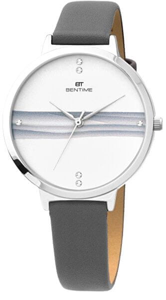 Za ure iz delavnice Bentime je značilna elegantna oblika in kakovostna izdelava po dostopni ceni. Minimalistična številčnica pritegne z intarziranimi cirkoni in pisanim motivom. Kovinskemu ohišju brezhibno sledi siv usnjeni pas, ki se odlično ujema z motivom na številčnici. Celoten opis