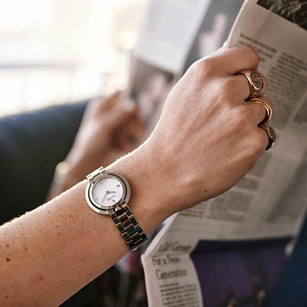 Elegantna in ženstvena, ta ženska ura Bulova iz poliranega jekla predstavlja popolno ravnovesje med subtilnostjo in modernim dizajnom. Njen osrednji element je nežno roza številčnica z biserovino . Namesto klasičnih indeksov ima številčnica subtilne detajle v obliki zvezd ali stiliziranih cvetov, ki poudarjajo romantičen značaj ure. Okroglo ohišje je originalno uokvirjeno z dvema povezanima krogoma, ki ju povezuje eleganten jeklen pašček, ki se elegantno prilagodi vsakemu zapestju. Ta ura Bulova je idealna izbira za žensko, ki išče kos nakita in praktičen modni dodatek v enem.