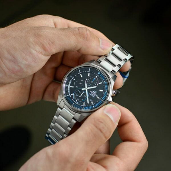 Ne glede na to, ali nosite uradno obleko ali udobno oblačilo za prosti čas, bo ura Edifice iz delavnice priljubljene Casio vedno natančno prilagodila vašo obleko. Na številčnici so trije kronografi štoparice, značilne luminiscenčne kazalke in datumski žig. Številka ure je prav tako prekrita s safirnim steklom, tako da ste lahko prepričani, da je na vašem steklu preprosto praska. Cenili boste tudi vodoodpornost do 100 metrov, zahvaljujoč kateri vam tudi med plavanjem ni treba sneti ure. Takoj, ko Casio jekleno uro, bo vaša obleka dobila povsem novo dimenzijo.
