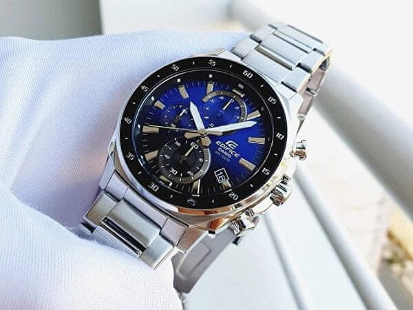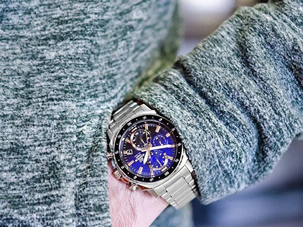 Ura Edifice iz delavnice Casio združuje brezčasno eleganco z živahnim športnim dizajnom. Padite pod njihovo čarovnijo in pritrdite ta spodobni model na zapestje. Modro-črna številčnica na prvi pogled pritegne s tremi honografi s funkcijo štoparice. Celoten opis