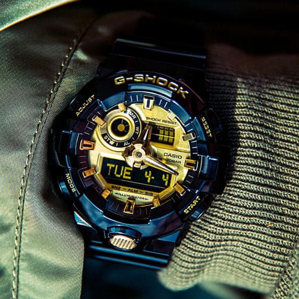 Ure Casio iz kolekcije G-Shock so narejene za moške, ki iščejo uro, ki bo zdržala skoraj vse. Zaradi uporabljenih materialov je njihovo ohišje in napetost zelo odporno na udarce, udarce in fizične poškodbe . Ljubitelji vodnih športov bodo uživali v vodoodpornosti do 200 metrov, zahvaljujoč kateri se lahko potapljate z uro. Zagotovo pa boste cenili zlato številčnico, ki združuje analogni čas z digitalnim zaslonom, ki ima številne funkcije:
