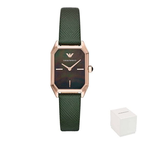 Ženska ročna ura Emporio Armani AR11149 je elegantna ženska ura. Oblikovana je minimalistično, a prefinjeno. Pravokotna številčnica v perla zeleni barvi z ozkim usnjenim paškom doda piko na i. Izraža sodoben in prefinjen in glamurozen slog, ki je značilen za Emporio Armani. S samo 25 g je ena lažjih ročih ur na trgu.