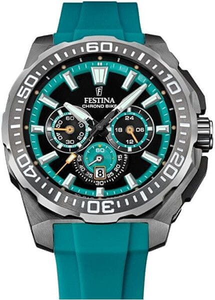 Ura Festina Chrono Bike 20725/6 sloni na energiji turkizne barve, ki bo odlično poživila vsak športni outfit. Silikonski pašček v oceanskih odtenkih se ujema s podrobnostmi na številčnici, ki vključuje kronograf, 24-urni prikaz časa in prikaz datuma. Celoten opis