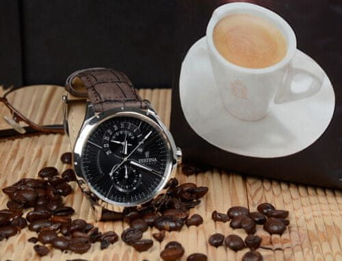 Ure iz delavnice priljubljene blagovne znamke Festina bodo na prvi pogled všeč vsem gospodom z nagnjenostjo k brezčasnim dodatkom. Njihova črna številčnica privlači dva oblikovalska kronografa z datumom in 24-urno funkcijo časa, zahvaljujoč sijočim rokam lahko odlično vidite trenutni čas. Celoten opis