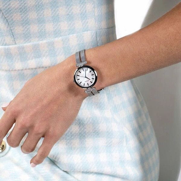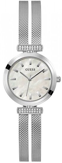 Se radi okrasite s stilskimi dodatki, ki jih res ne gre zgrešiti? Potem boste nad urami Guess dobesedno navdušeni. Že na prvi pogled vas bo očaral popolnoma srebrn dizajn ure. Uro pritrdite na zapestje s popolnoma prilagodljivim milanskim zategom . Stekleni kamenčki se iskrijo ob vsakem gibu zapestja. Biserna številčnica v minimalističnem slogu je okrašena samo s kazalci in indeksi. Pokažite okolici, katera modna znamka vam je prirasla k srcu in bodite popolni v vseh okoliščinah.