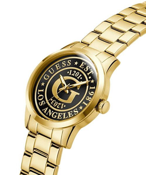 Dvignite svoj stil na višjo raven z elegantno uro Guess Collegiate G. Zaradi zlate barve in prefinjenega dizajna je nepogrešljiv dodatek, ki izžareva razkošje in samozavest. Številčnica ima drzen logotip Guess z napisom „Los Angeles“ in zvezdicami, kar uri daje ikoničen in eleganten videz. Celoten opis