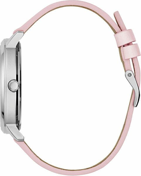 Ženske ure Guess se opirajo na minimalističen dizajn. Pustite se očarati nad nežno številčnico z rožnatimi elementi in bleščečimi kamni namesto glavnih indeksov. Okroglo ohišje je izdelano iz nerjavečega jekla. Ura se na zapestje pritrdi z usnjenim paščkom .