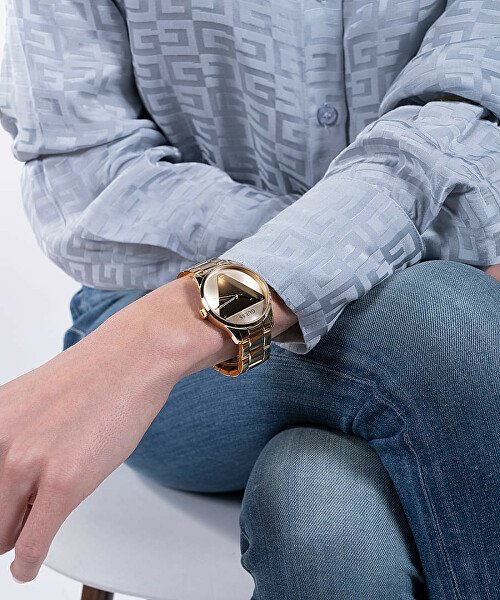 Se radi okrasite s stilskimi dodatki, ki jih res ne gre zgrešiti? Potem boste nad urami Guess dobesedno navdušeni. Njihova številčnica bo že na prvi pogled padla v oči s trikotnikom z dizajnerskimi vijaki. Ura je pritrjena na zapestje z jekleno zaponko v luksuznem zlatem zaključku. Celoten opis