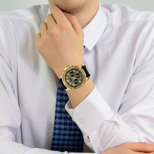 Neizostavljiva ura priljubljene blagovne znamke Guess bo razveselila vsakega gospoda, ki hrepeni po izjemnem modnem dodatku. Na prvi pogled boste prepričani, da vas ura Frontier nikoli ne bo dolgočasila. Pozornost pritegne nazobčana okvirna plošča, katere obod je obložen z bleščečimi kamni. Isti kamni so okrašeni tudi s črnim trakom. V številčnici najdemo tri kronografe s funkcijo indikatorja datuma, dneva v tednu in 24-urnega časa . Vse to dopolnjujejo arabske številke in kazalci s sijajem. Uživali boste tudi v vodoodpornosti 10 ATM, ki omogoča plavanje z uro, pritrjeno na zapestje. Privoščite si razkošen dodatek, ki ne bo razočaral.