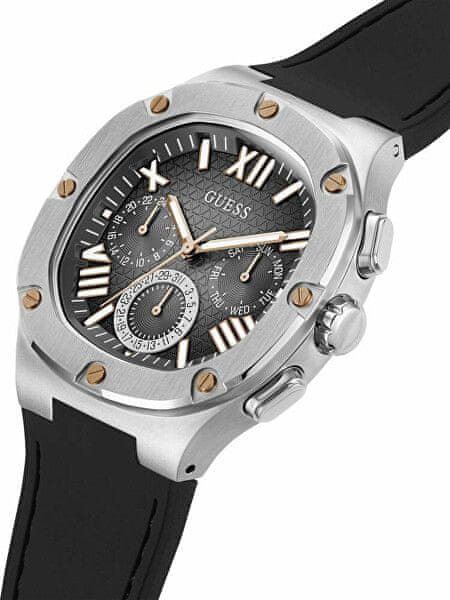 So vam všeč robustne ure? Boste prenašali kakovostno izdelavo in eleganten dizajn? Potem je ura priljubljene znamke Guess odlična izbira. Že na prvi pogled pritegne pozornost jekleno ohišje z masivnim okvirjem. Številčnica ponuja pogled na lahko berljive kazalce z rimskimi indeksi in tremi kronografi , ki prikazujejo trenutni datum, dan v tednu in 24-urni čas . Uro pritrdite na zapestje z udobnim silikonskim paščkom. Stavite na moško uro v brezčasnem stilu, ki ne bo nikoli šla iz mode.