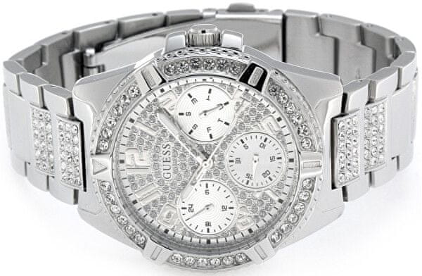 Čarobna ura priljubljene blagovne znamke Guess je uresničitev sanj za vsako žensko, ki hrepeni po izjemnem modnem dodatku. Na prvi pogled boste prepričani, da vas ura Lady Frontier nikoli ne bo dolgočasila. Pozornost pritegne značilen okvir, katerega obod je obložen z bleščečimi kamni. Isti kamni so okrašeni tudi s srebrno potezo iz nerjavečega jekla. Najdemo jih tudi v številčnici, poleg treh kronografov s funkcijo indikatorja datuma, dneva v tednu in 24-urnega časa . Vse to dopolnjujejo arabske številke in kazalci s sijajem. Privoščite si razkošen dodatek, ki ne bo razočaral.