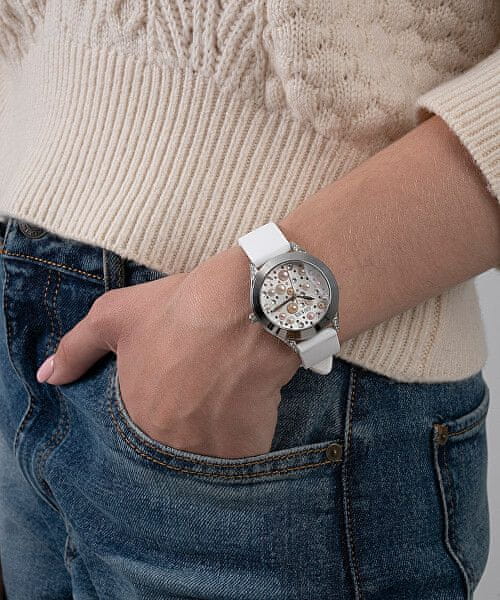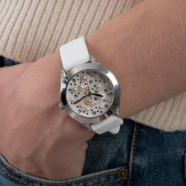 Eleganten in preprost dizajn. Visoka kakovost izdelave. Bleščeči kamni na jeklenem ohišju, biserna mati v številčnici. Ure Guess vam bodo na prvi pogled padle v oči. Na zapestje jih zapneš z belim paščkom iz udobnega silikona.
