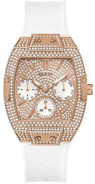 Boste kupili izjemen modni dodatek, ki ga nihče ne bo pogrešal? Stavite na luksuzne ure z oznako Raven . Lesketajoči se cirkoni, vdelani po celotnem jeklenem ohišju, naredijo uro pravi biser. Zanimiva podrobnost so tudi oblikovni vijaki na ohišju iz rožnatega zlata. Številčnica vsebuje tri kazalce, ki prikazujejo datum, dan v tednu in 24-urni čas . Ura se na zapestje pritrdi z udobnim silikonskim paščkom. Privoščite si razkošje v obliki ure iz delavnice priljubljene znamke Guess.