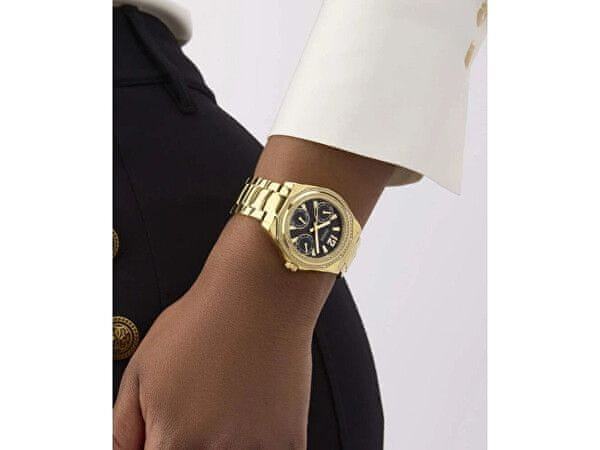 Ženska ura Guess Ritzy GW0685L5 je popolna kombinacija razkošja in moderne elegance. Zlato ohišje ure je videti prepoznavno in prefinjeno, temno zelena številčnica pa daje modelu globino in edinstven značaj. Okvir, okrašen z majhnimi kamni, se nežno lesketa z vsakim gibom in poudarja ženski čar. Celoten opis