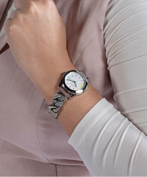 Ure iz modne delavnice Guess so kot nalašč za vse ljubitelje stilskih dodatkov. Njihova majhna številčnica stavi na minimalističen videz. Hod iz nerjavečega jekla je posut z barvnimi kamenčki . Stavite na dodatek, ki bo popestril vsako vašo opravo.