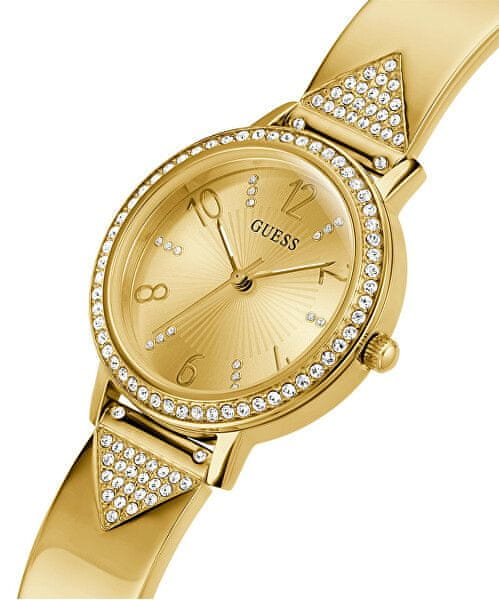 Ure iz modne delavnice Guess se bodo na prvi pogled zaljubile vse dame, ki so nagnjene k nepogrešljivim dodatkom. Zlata številčnica, ohišje in mehanski mehanizem so posuta z bleščečimi kamni. Všeč vam bo tudi majhna velikost. Privoščite si dodatek, ki ga ne boste spregledali.