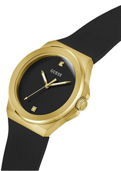 Ura GUESS Vinyl je minimalističen in eleganten dodatek za moške, ki cenijo preprostost v kombinaciji z luksuznim dizajnom. Zlato ohišje v kombinaciji s črno številčnico in silikonskim paščkom ustvarja prefinjen in moderen videz. Črna številčnica je okrašena z zlatimi indeksi kvadratne oblike, ki dajejo uri čist in minimalističen značaj. Zlati kazalci so v kontrastu s temnim ozadjem, da zagotovijo odlično berljivost in poudarijo eleganten dizajn modela. Ohišje ure je izdelano iz jekla v zlati izvedbi, kar daje uri ekskluziven videz. Črn silikonski trak zagotavlja udobno nošenje in dodaja športni pridih. Model poganja natančen kvarčni mehanizem in je zaščiten z mineralnim steklom. Model Vinyl GW0790G1 je idealna izbira za moške, ki iščejo kombinacijo elegance, preprostosti in modernega sloga v enem brezčasnem dodatku.