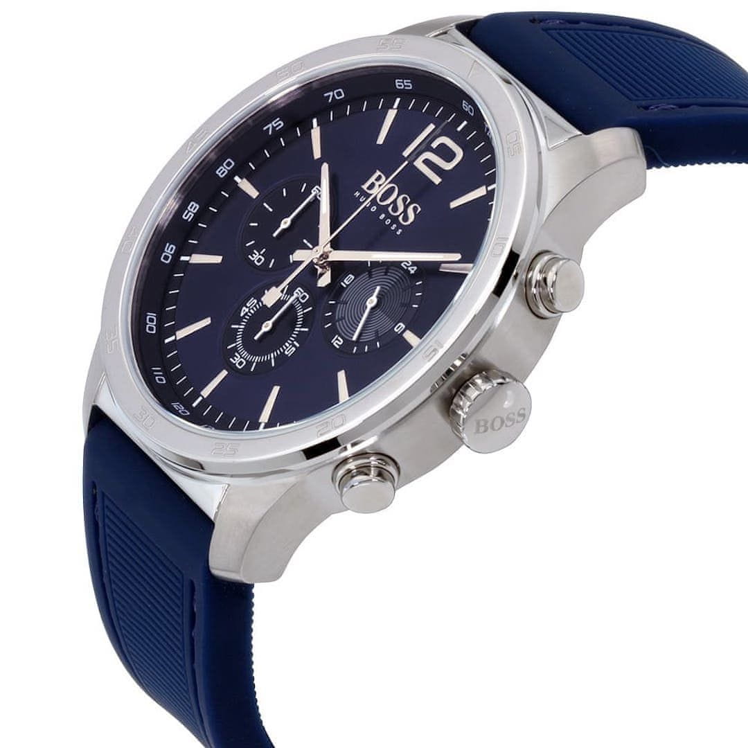 Moška ročna ura Hugo Boss Professional 1513526 je privlačna in funkcionalna ura. Presezite svoje meje in izboljšate zmogljivost. Hugo Boss Professional je ura za tiste, ki si iz dneva v dan prizadevajo premagati najboljše od najboljših. Ta športna kronograf ročna ura ima 44 mm veliko ohišje. Slednje je iz nerjavečega jekla, prevlečenega z ionsko prevleko, ki poskrbi za še večjo trdnost in odpornost proti praskam. Izgled ure pa zaokroži Hugo Boss napis na silikonskem paščku in zaponki paščka.