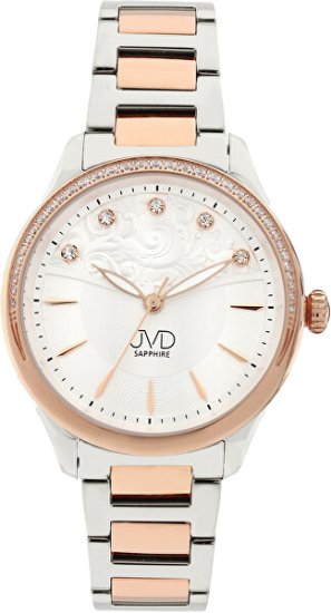 Privlačna ženska ura blagovne znamke JVD odlično dopolni vsak outfit. Ohišje in pašček sta izdelana iz plemenitega jekla. Zgornji del ohišja je okrašen z več bleščečimi kamni, pet drugih se lesketa znotraj številčnice kot del cvetličnega motiva. Dva majhna kazalca sta opremljena z luminescenco. Vse to je shranjeno pod safirnim steklom, ki je bolj odporno na praske in omogoča, da ura obdrži sijaj več let. Razveselite se z okusnim dodatkom, ki se ga ne boste kar tako naveličali.