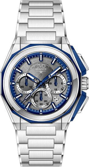 Ura JVD Seaplane Quartz JE1017.2 je primer natančne kombinacije sodobne tehnologije in brezčasnega oblikovanja. Njen videz temelji na elegantnem kontrastu srebrne številčnice z modrimi podrobnostmi, ki modelu dajejo športno-eleganten značaj in izrazito vizualno globino. Modri poudarki na kazalcih, ročicah in lunetah so dinamični, hkrati pa ohranjajo prefinjen slog, primeren tako za prosti čas kot za bolj formalne priložnosti.