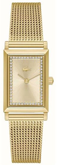 Ura Lacoste Catherine je luksuzni dodatek za ženske, ki cenijo prefinjenost in brezčasno eleganco. Ta popolnoma zlat model s pravokotno številčnico, okrašeno s kristali, prinaša ekskluziven videz, primeren za posebne priložnosti in vsakodnevno nošenje.