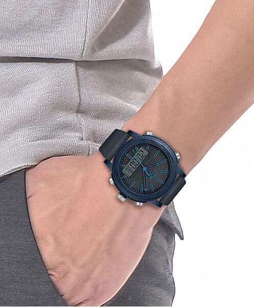 Z urami iz modne delavnice Lacoste lahko svoj outfit izpopolnite do popolnosti. Kombinirana številčnica z digitalnim zaslonom navduši z zelo čitljivimi kazalci in indeksi. Ohišje je izdelano iz visokokakovostnega nerjavečega jekla in skupaj s silikonskim paščkom tvori popolno celoto. Celoten opis