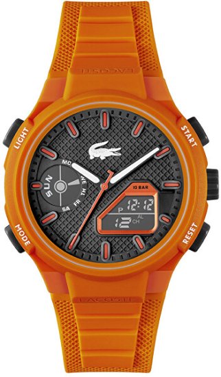 Kombinirana ura Lacoste vas bo osvojila s svojim športno svežim dizajnom. Na roki je skoraj ne boste čutili, saj je pritrjena z udobnim silikonskim paščkom v oranžni barvi. Na številčnici krožijo klasični kazalci, na zaslonu pa boste videli tudi digitalni čas. Celoten opis
