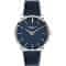 Moška ročna ura Baterijsko napajanje Premer ohišja 44,0 mm Ohišje v obliki kroga Kovinsko ohišje Srebrna barva ohišja Usnjen pas TMAVO BLUE barva pasu Ročna številčnica TMAVO BLUE barva številčnice Številka z dvanajstimi indeksi Material stekla – mineralno steklo Vodoodporna med prhanjem in pranjem