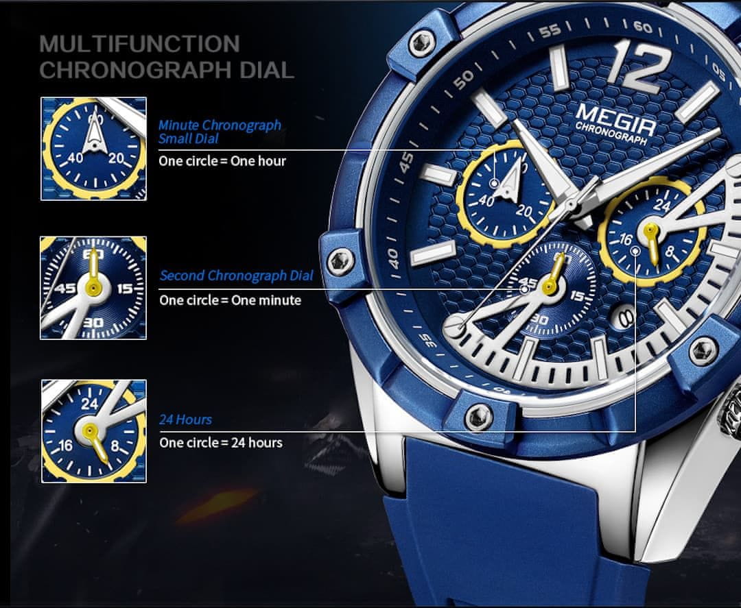Moška ročna ura Megir Bulge je športno elegantna modna ura z analognim prikazovalnikom in paskom iz kvalitetne gume.
