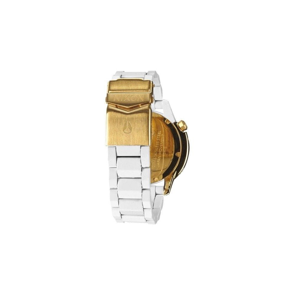 Proizvajalec: NIXON; Model: MONARCH REDNA CENA: 1.159,00 PLN Barva: BELA/ZLATA Mehanizem: japonski kremenčev Miyota s 3 kazalci, prikaz datuma na položaju 4. ure. Številčnica:Poševna luneta okoli številčnice, ročno ulite kazalce, ročno brušene urne oznake z diamantnim brušenjem. Celoten opis