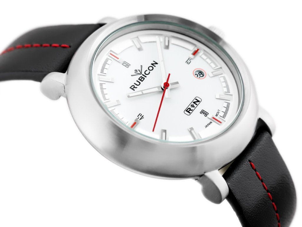 Barve: Srebrna številčnica, srebrno ohišje, črn pas, rdeči šivi in rabljeni kazalec.