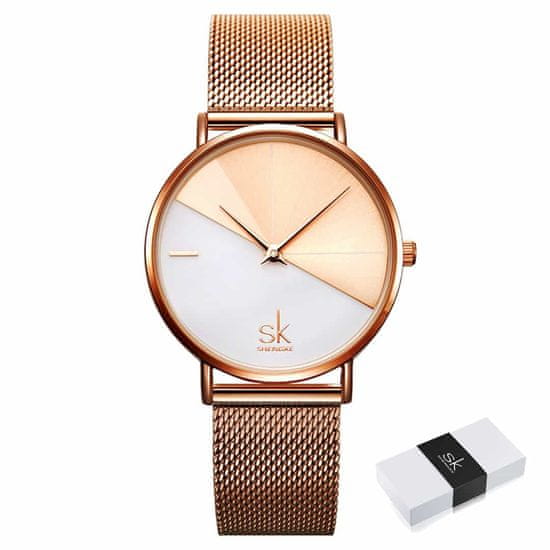 Odkrijte popolno kombinacijo prefinjenosti in modernega dizajna z žensko ročno uro SK Shengke DuoTone Metal Rose Gold. Ta čudovita ura je zasnovana za ženske, ki cenijo minimalistično eleganco in visoko kakovost. Ženska ročna ura SK Shengke DuoTone Metal Rose Gold se ponaša z očarljivo dvobarvno številčnico, ki je hkrati moderna in prefinjena. S preprostimi kazalci in oznakami ur, ta ženska ročna ura izžareva minimalističen in eleganten videz.