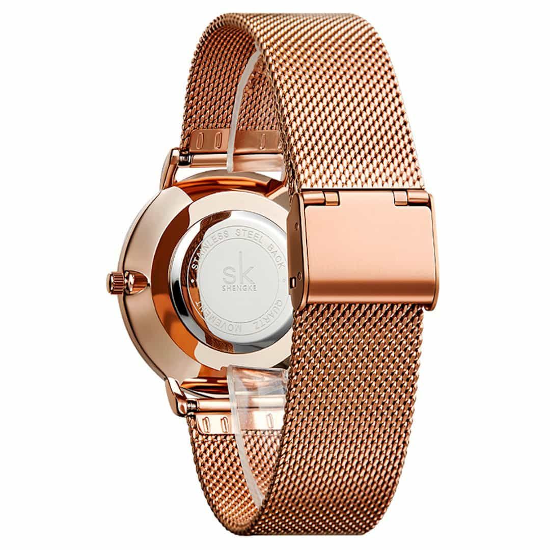Ohišje ure je izdelano iz nerjavečega jekla, kar zagotavlja trajnost in odpornost na vsakodnevno obrabo. Zadnji del ohišja je prav tako izdelan iz nerjavečega jekla, kar prispeva k splošni trpežnosti in kakovosti ure. Ura SK Shengke DuoTone Metal Rose Gold uporablja zanesljiv kvarčni mehanizem, ki zagotavlja natančnost.