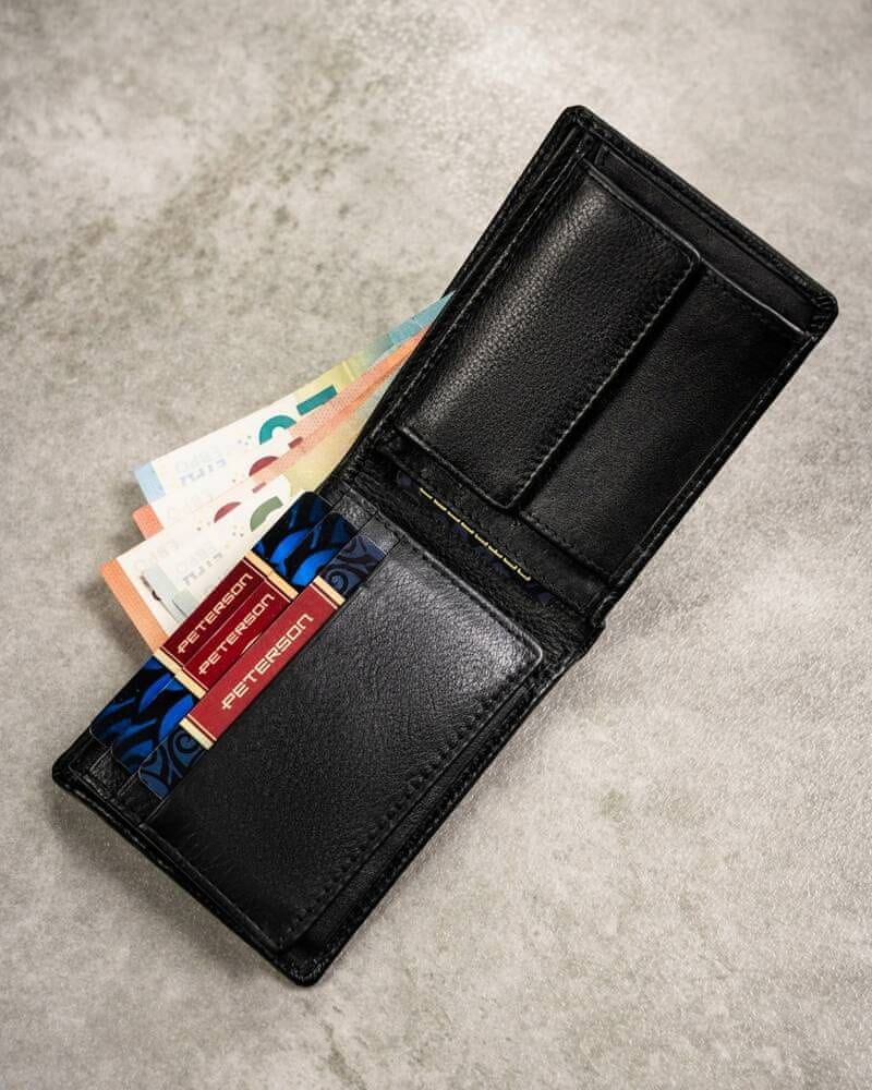 • Klasični slog | Črna denarnica. Sprednja stran je okrašena z vtisnjenim logotipom blagovne znamke. Ležeči model, brez zunanje zaponke;