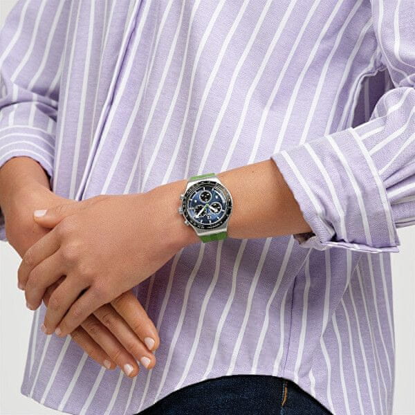 Športna, elegantna ura Swatch s kontrastno kombinacijo zelene in modre barve. Čitljiva številčnica s svetlečimi kazalci in tahimetrična skala poudarjata športni značaj te ure.