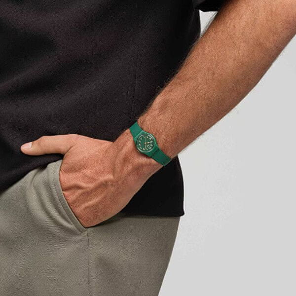 Ko si boste nadeli uro Swatch na zapestje, boste v središču pozornosti. Ura bo na prvi pogled pritegnila vaš pogled s svojim svežim dizajnom, ki se bo odlično podal k vsaki obleki za prosti čas. Njena zelena številčnica je zelo enostavno berljiva zaradi značilnih kazalcev in indeksov. Plastično ohišje je povezano s paščkom iz biomateriala. Z uro Swatch boste izstopali iz množice.