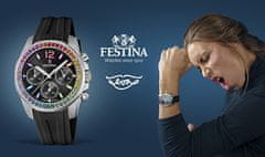 Elegantne ure Festina so ustvarjene za ženske, ki se rade okrasijo z elegantnimi in kakovostnimi dodatki. Na biserni številčnici izstopajo trije kronografi s funkcijo štoparice. Zahvaljujoč vodoodpornosti 10 ATM vam ure ni treba sneti niti med plavanjem.