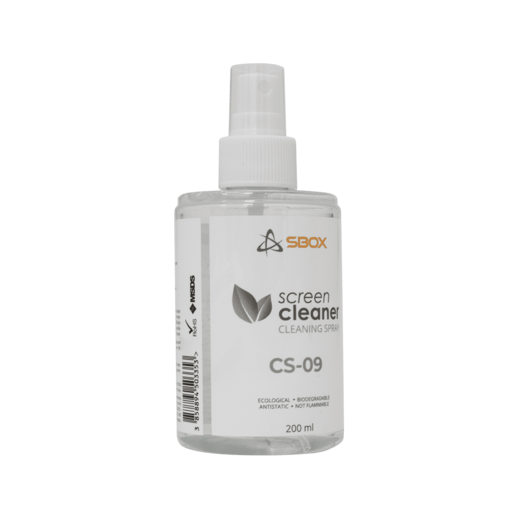 Ohranite svoje zaslone brez madežev s čistilom za zaslone SBOX CS-09. Ta 200 ml raztopina zagotavlja nedotaknjen zaslon. Je antistatičen, brez alkohola, biorazgradljiv in negorljiv, kar zagotavlja varno in okolju prijazno izkušnjo čiščenja.
