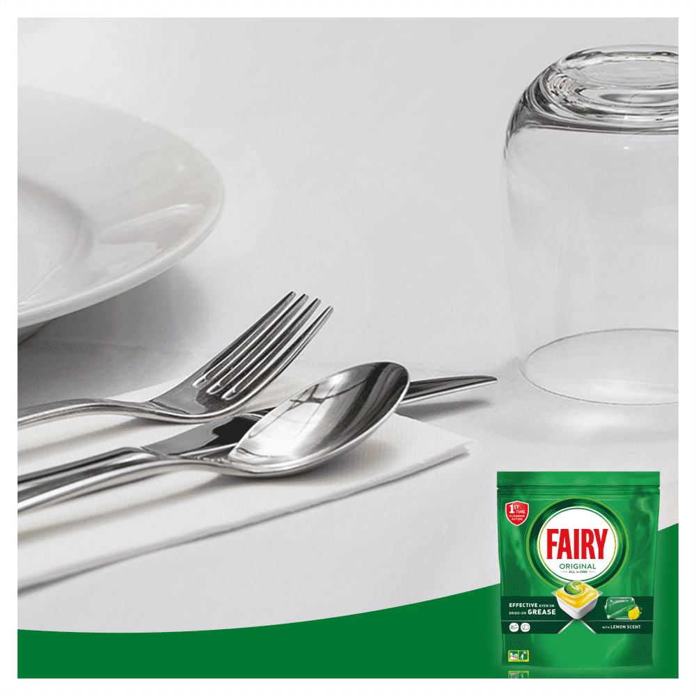 Fairy Original tablete za pomivalni stroj vse v enem zagotavljajo odlične rezultate čiščenja že v prvem poskusu in učinkovito odstranjujejo celo zasušeno maščobo, zaradi česar je posoda bleščeče čista. Tablete za pomivalni stroj Fairy združujejo tekočino in prašek v eni močni kapsuli. Raztopijo se neverjetno hitro, zato začnejo delovati takoj. In so neverjetno enostavne za uporabo. Ni jih treba razpakirati. Preprosto jih stresite v predal za detergent vašega pomivalnega stroja.