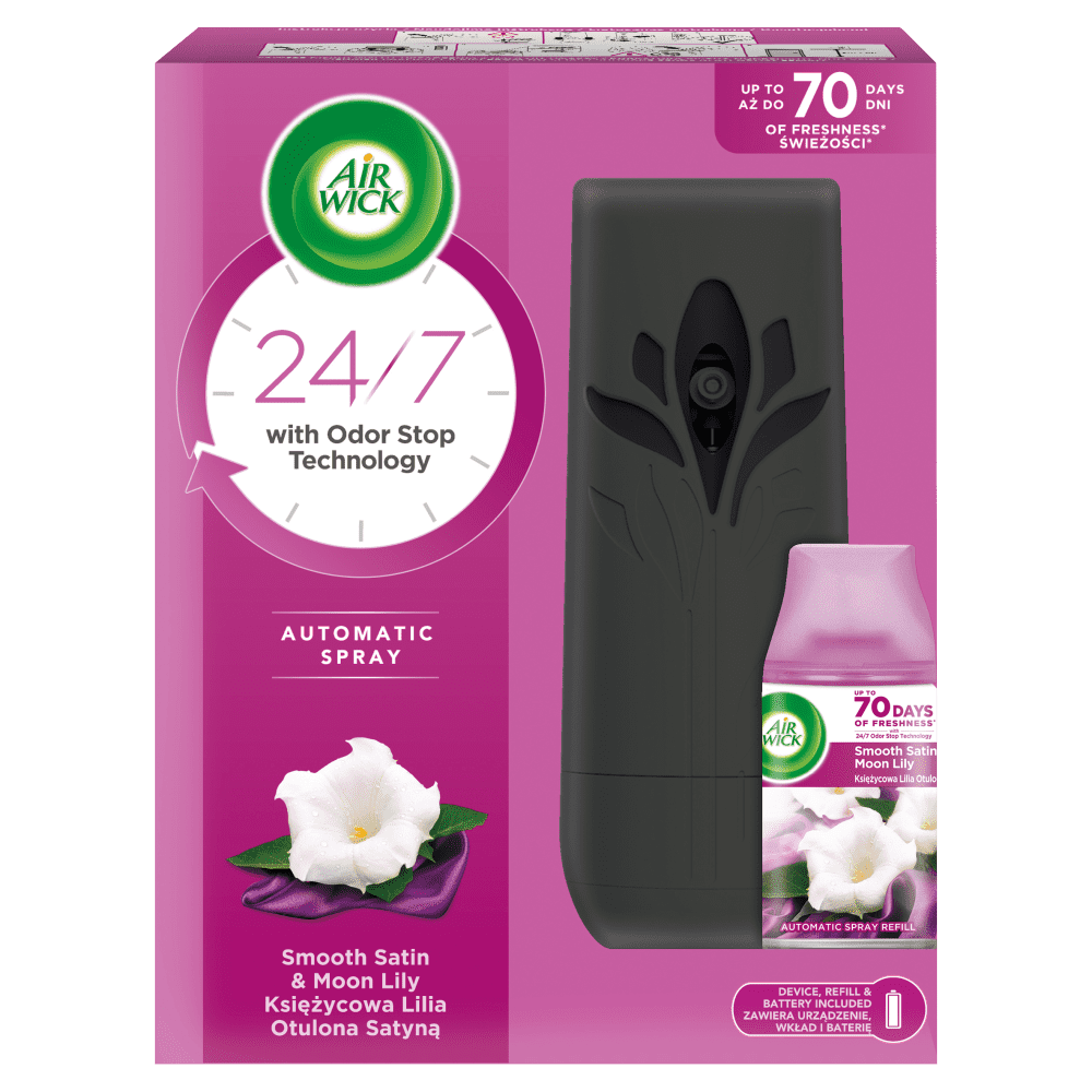 Avtomatski osvežilec zraka Air Wick z vonjem lunine lilije, prevlečen s satenom. Nevarno. Zelo lahko vnetljiv aerosol. Posoda pod tlakom: Lahko poči pri segrevanju. Pred uporabo preberite etiketo. Hraniti izven dosega otrok. Če potrebujete zdravniški nasvet, imejte pri roki posodo ali etiketo. Hraniti ločeno od vročine, vročih površin, isker, odprtega ognja in drugih virov vžiga. Prepovedano kajenje. Ne pršite v odprt ogenj ali drug vir vžiga. Ne preluknjajte ali sežigajte, niti po uporabi. ČE PRIDE V OČI: Previdno izpirajte z vodo nekaj minut. Odstranite kontaktne leče, če jih imate in če to lahko storite brez težav. Nadaljujte z izpiranjem. Zaščitite pred sončno svetlobo. Ne izpostavljajte temperaturam nad 50 °C/122 °F. Vsebino/posodo zavrzite v skladu z lokalnimi/regionalnimi/nacionalnimi/mednarodnimi predpisi. Vsebuje linalol. Lahko povzroči alergijsko reakcijo. Osebe s preobčutljivostjo na dišave naj ta izdelek uporabljajo previdno. Osvežilci zraka ne nadomeščajo dobre gospodinjske higiene. Uporabljajte po navodilih. HRANITI IZVEN DOSEGA OTROK IN HIŠNIH ŽIVALI. Uporabljajte v dobro prezračevanih prostorih. PREDEN ZAMENJATE POLNILO DIŠAVE, SE PREPRIČAJTE, DA JE STIKALO V POLOŽAJU IZKLOP. Preberite in upoštevajte navodila na embalaži polnila. Uporabljajte samo polnila Air Wick. PREVIDNOSTNI UKREPI: Pred uporabo preberite in upoštevajte varnostne ukrepe ter shranite ta navodila. Ta naprava deluje na baterije. SAMO ZA UPORABO ODRASLI. Ni namenjeno uporabi otrokom ali osebam z zmanjšanimi telesnimi, senzoričnimi ali duševnimi sposobnostmi. NAPRAVO POSTAVITE NAD VIŠINO OČI (NAJMANJ 2 M NAD TLI). Uporabljajte samo alkalne baterije. Prepričajte se, da je baterija pravilno vstavljena v napravo, pri čemer upoštevajte oznaki (+) in (-). Če pride do puščanja baterije, jo odstranite in napravo temeljito očistite. Če naprave ne nameravate uporabljati dalj časa, odstranite baterijo. Če nameravate biti odsotni več kot en teden, napravo izklopite. Napravo zaščitite pred viri toplote, ognjem, električnimi napravami in neposredno sončno svetlobo (>50˚C). Baterij ne smete izpostavljati vodi, ognju ali visokim temperaturam. Ne povzročajte kratkega stika. Baterije ne polnite. Odstranjevanje: Upoštevajte veljavne zakonske predpise. Odstranite baterijo. Odstranite rabljeno posodo z kartušo. Napravo odvrzite v ustrezno označen koš za smeti. Preden zamenjate kartušo z dišavo, se prepričajte, da je stikalo naprave v položaju IZKLOP. Pred vklopom usmerite vtičnico naprave stran od obraza. Naprava bo samodejno sprostila dišavo 15 sekund po vklopu. Zaradi varnostnih razlogov upoštevajte navodila za uporabo na embalaži. OPOZORILO: Uporabljajte samo po predvidenem namenu. Namerna zloraba z namernim ustvarjanjem visokih koncentracij in vdihavanjem vsebine je lahko škodljiva ali smrtno nevarna. Ne vdihavajte aerosola. Uporabljajte v dobro prezračevanih prostorih. V avtomobilih, v bližini pečic in kaminov se lahko pojavijo ekstremne temperature. Embalažo izdelka je mogoče reciklirati le, če je popolnoma izpraznjena. Spolzko na trdih površinah. Simbol prečrtanega smetnjaka na kolesih označuje ločeno zbiranje električne in elektronske opreme. Ta naprava vsebuje 1 baterijo AA. Odstranjevanje: Ko je baterija izpraznjena, jo zamenjajte z novo. Rabljeno baterijo zavrzite v skladu z lokalnimi predpisi. Rabljene baterije in rabljeno električno in elektronsko opremo je prepovedano odlagati skupaj z drugimi gospodinjskimi odpadki. Za odstranjevanje takšnih izdelkov so na voljo ustrezna zbirna mesta za recikliranje rabljene električne in elektronske opreme. Pravilno odstranjevanje rabljene električne in elektronske opreme preprečuje morebitne negativne posledice za okolje in zdravje ljudi, ki bi sicer lahko nastale zaradi neustreznega ravnanja s tem izdelkom. Pravilno recikliranje pomaga ohranjati naravne vire.