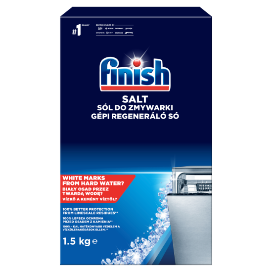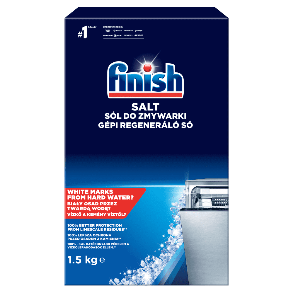 Sol za pomivalni stroj Finish. Trda voda lahko pusti vodni kamen na posodi in povzroči, da se ta nabere na težko dostopnih mestih pomivalnega stroja, kar lahko zmanjša njegovo učinkovitost. Sol Finish je posebej zasnovana za mehčanje vode in zaščito pomivalnega stroja pred škodljivimi učinki trde vode. Sol Finish je priporočljiva pred drugimi vrstami kuhinjske soli, ki lahko vsebujejo nečistoče, ki povzročajo poškodbe pomivalnega stroja. Zaradi visoke čistosti sol Finish zagotavlja 100 % boljšo zaščito pomivalnega stroja pred nabiranjem vodnega kamna. **2-krat boljša zaščita pred nabiranjem vodnega kamna na komponentah pomivalnega stroja v primerjavi z uporabo samo detergenta Finish.