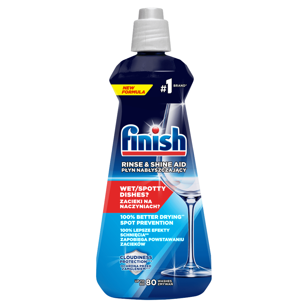 Poslovite se od mokre in radovedne posode! Sredstvo za izpiranje Finish je vaš zaveznik v boju za popolnoma čisto in sijočo posodo. Zagotavlja 100 % boljše rezultate sušenja* v primerjavi z uporabo samo detergenta Finish, s čimer odpravlja potrebo po brisanju rok.