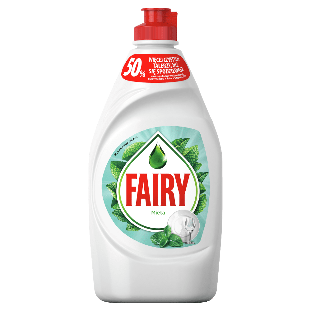 Detergent za pomivanje posode Fairy ponuja originalno čistilno moč Fairy in osvežujoč vonj po meti.