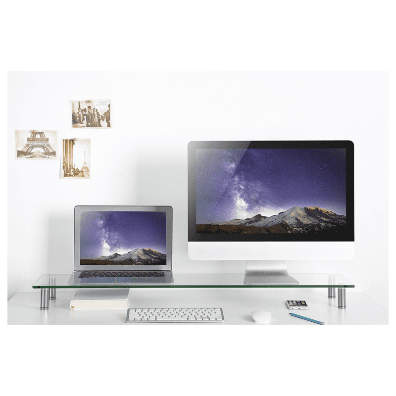Stojalo za monitor/prenosnik iz kaljenega stekla Gembird MS-TABLE-GL-01. Zelo dolga zasnova zagotavlja dovolj prostora za 2 monitorja, višinsko nastavljive noge za optimalno postavitev in kot gledanja.