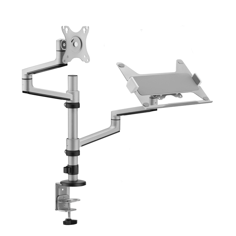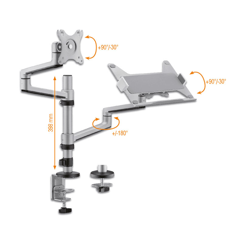Namizni nosilec z roko za monitor in stojalom za prenosnik MyWall HL 52L. Podpira monitorje do 32" in 8 kg ter prenosnike do 17,3" in 5 kg.
