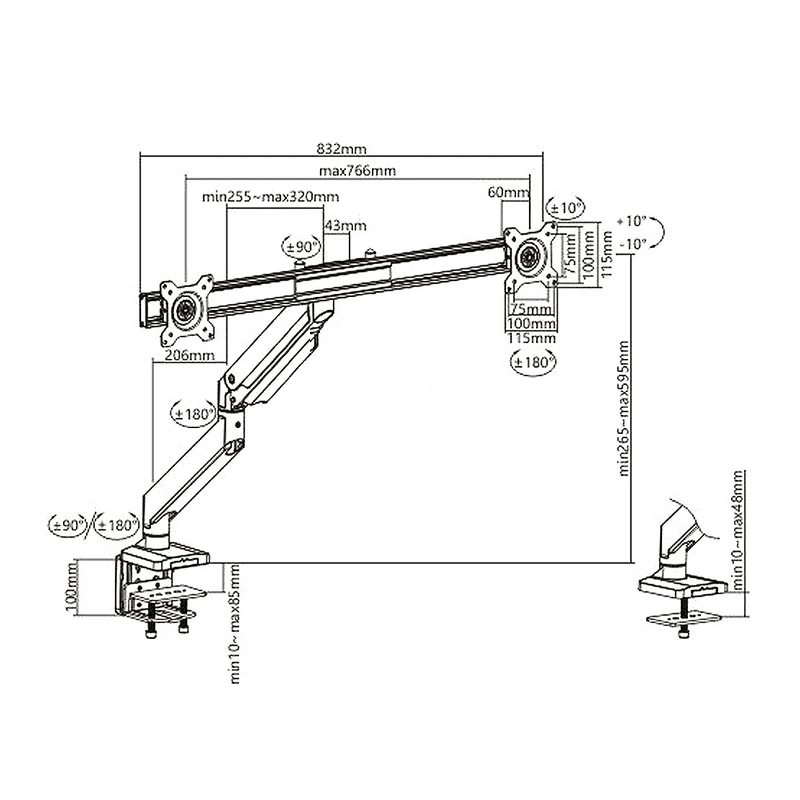 Blagovna znamka: NanoRS Najmanjši / največji horizontalni razmik med luknjami: 75/100 mm Najmanjši / največji vertikalni razmik med luknjami: 75/100 mm Trdna konstrukcija, zelo enostavna montaža Visoka kvaliteta Plinska vzmet za nastavitev višine v območju od 260 do 600 mm Objemka za kable Stopnjo naklona lahko nastavite od + 10 ° do –10 ° Ročaj lahko namestite na mizo VESA standard: 75×75, 100×100 Zasnovan za 17 „- 32“ monitorje (ali večje, če njihova teža ne presega 8 kg in je standard VESA združljiv z ročajem) Barva: črna